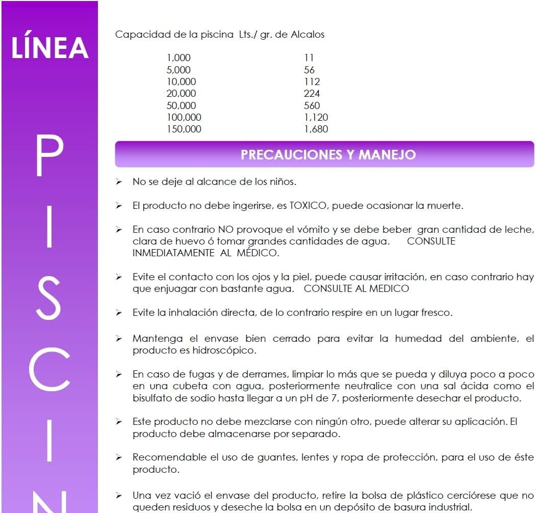 - Producto que es muy agresivo por lo que su manejo tiene que ser de mucho cuidado ( sí el producto se maneja directamente, puede causar fuertes excoriaciones en la piel), por lo que se recomienda usar guantes de protección y hacer el uso de un cucharón para adicionarlo directamente en la piscina, de preferencia sobre las boquillas de retorno para que el producto se disperse.
