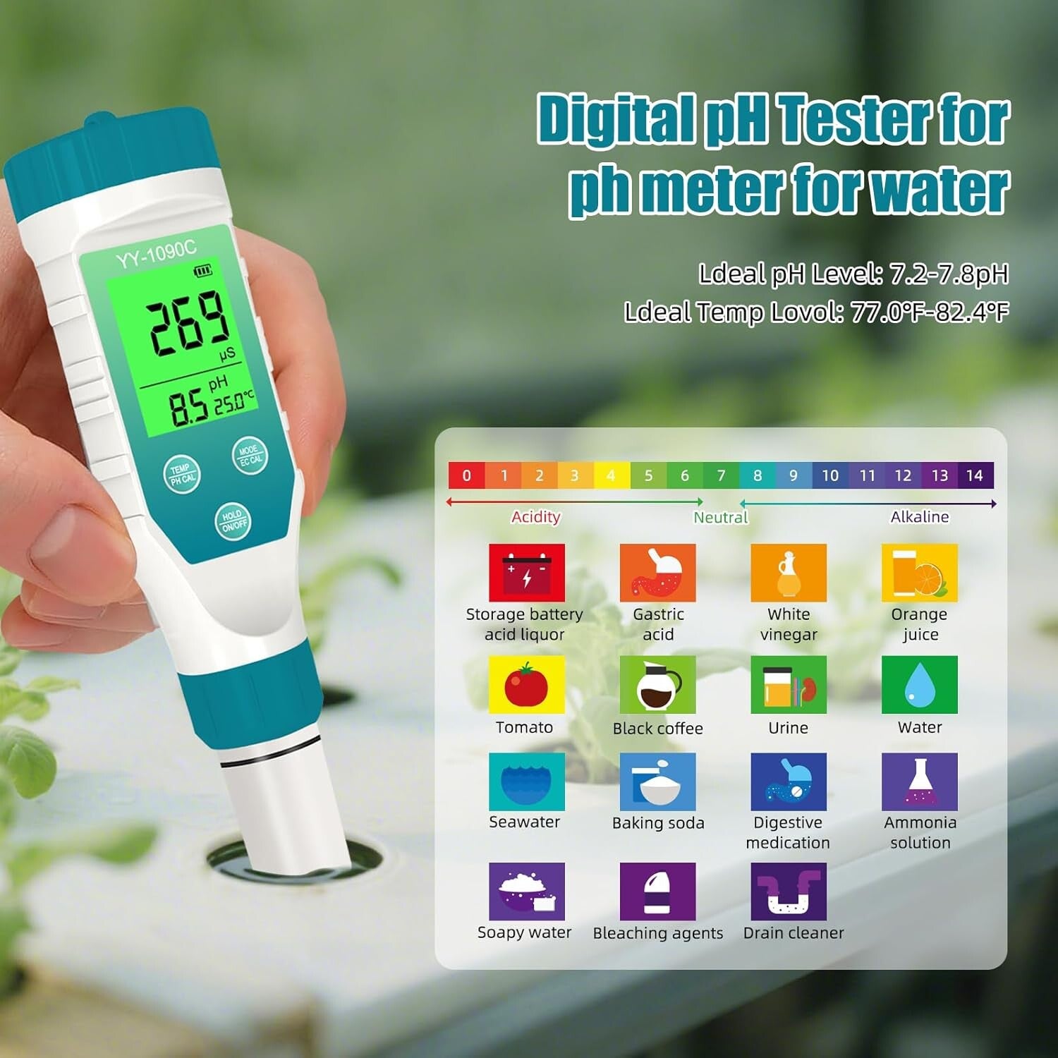 - Monitor de calidad del agua de 5 parámetros todo en uno: un dispositivo mide el pH, la salinidad (ppm/ppt), TDS, EC y temperatura simultáneamente. Ideal para piscinas de agua salada, jacuzzis, spas, estanques koi, hidroponía, agua potable y pruebas de acuarios.